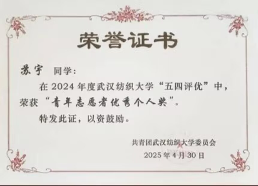 员工工作与志愿活动中,苏宇践行着“在服务中成长”的真谛。无论是担任学习委员协助老师处理班级学业事务,还是作为院体育部部长、乒乓球副队长组织各类文体活动,她都尽心尽力、踏实履职,用责任与热忱为师生服务。作为乒乓球爱好者,她将运动中的竞技精神融入学习与工作,做到全面发展。在志愿活动中,她始终怀揣热爱,不把服务当作简历上的装饰,而是在帮助他人的过程中锤炼品格、遇见更好的自己,用实际行动传递青春正能量。