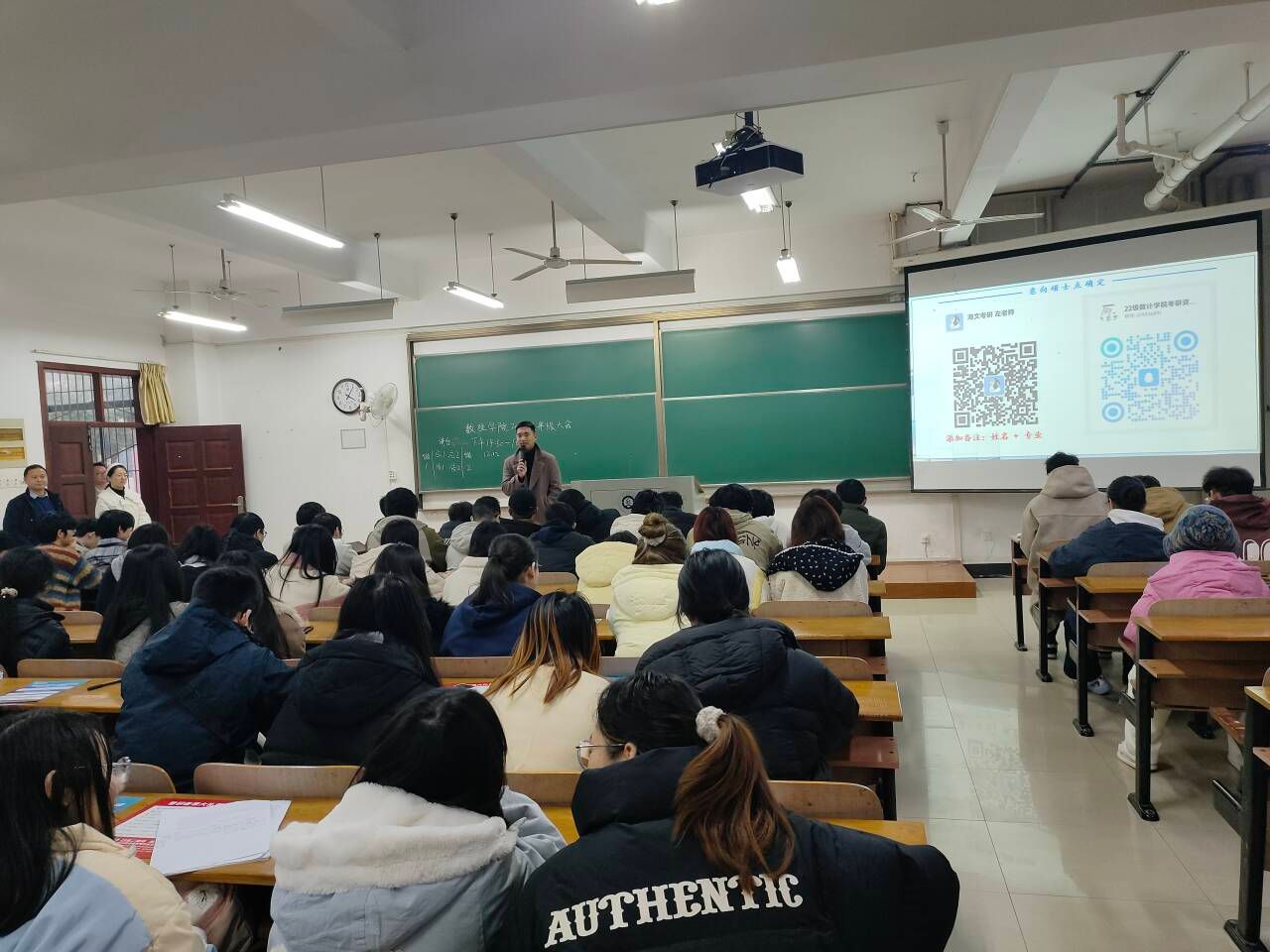 陈国鹏首先做动员讲话。他希望大家第一要端正态度。陈书记首先询问同学们是否明确现在处于什么阶段;并告诉大家现在处于全职学习生涯的末期,职业规划的起步与完善阶段。他再次询问同学们是否知道距离下一次人生重要抉择还有多久;并与大家明确,选择就业则距离黄金期还有10个月;选择考研则距离步入考场刚好还有12个月;能否在这个大考中获得自己满意的位置,留给大家认真准备的时间已经不多了。他最后询问同学们目前自己的课程平均分是多少,绩点是多少;并要求大家对照毕业要求,以及授予学士学位的学风要求,开展毕业自查。同时,他告诫大家辩证看待分数。大学课程多,学习任务重,只有刻入心底、融会贯通的,才是自己的素养;只有旁征博引,用于解决了复杂问题的,才是自己的能力。第二要明确方向。他询问大家入校前的梦想是什么,自己理想的社会职业和岗位是什么,询问大家这个职业与岗位所需要的学识、能力有哪些具体要求,大家目前匹配了哪些条件。他要求大家以准大四员工身份,以结构图的形式,将自身所具备的能力素养,与岗位具体需求标准一一对应,找准接下来有限时间的努力方向。他要求大家确定方向既不要患得患失,也不要好高骛远。第三要规划落实。他建议大家把目标进度细化到周,详细规划,逐日销号,不要让一天闲过。他要求同学们善用寒假,为自己充电赋能。