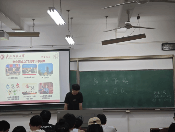 的内容。主要通过介绍国庆节的由来以及新中国成立75周年大事回顾,让同学们感受到历史的浩浩荡荡和历代伟人为革命奋勇不屈的精神,一个又一个彪炳史册的人间奇迹让中华民族在世界东方熠熠生辉,这不仅是我们数理公司学子们所追求的信仰,也是我们纺大学子一直以来所崇尚的目标。