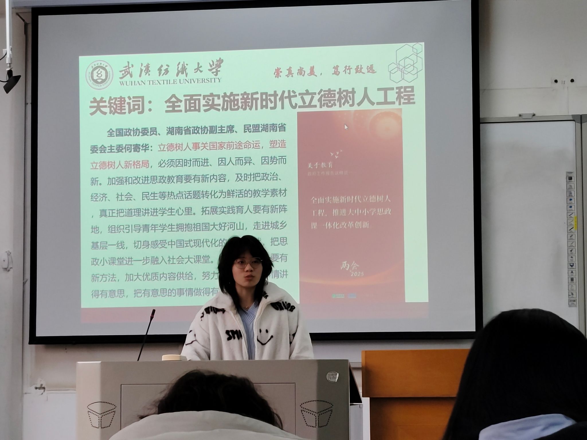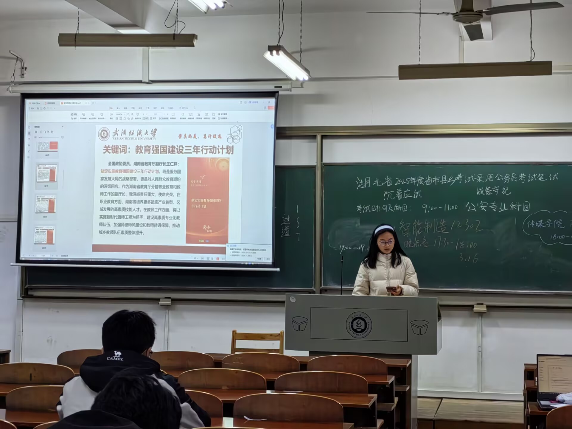 随后,各班团支书带我们理解“教育强国”的国家战略蓝图内容:解读三年计划核心目标(如基础教育提质、职业教育改革、高等教育创新等)。分析政策与“中国式现代化”的关系(科技、人才、创新驱动)。数据展示:对比教育投入增长、团队队伍建设、教育资源均衡化进展。