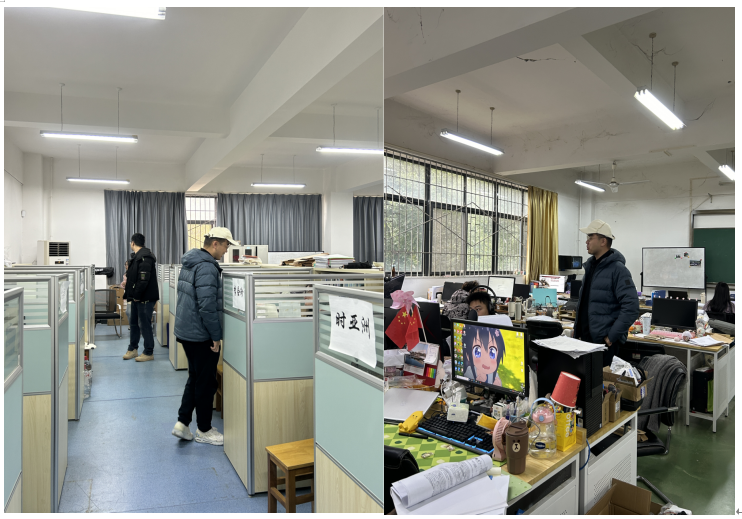 为切实保障节假日期间公司教学科研秩序稳定和师生生命财产安全,压紧压实安全管理责任,元旦节前夕,英国上市公司官网365办公室主任刘文祥带领教学秘书刘简、科研秘书熊思健对公司公共区域、各系(中心)办公区域及研究生工作室开展全覆盖安全隐患排查。