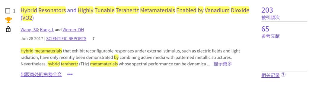 传统超材料不可重构,工作波段单一且无法调谐,通过引入相变材料利用外部激励(热、电、泵浦光),实现动态可调谐太赫兹光电子器件,对电磁波进行有效调控。上述成果以“Hybrid Resonators and Highly Tunable Terahertz Metamaterials Enabled by Vanadium Dioxide (VO2)”为题,发表在nature子刊《Scientific Report》。该论文研究的是金属-VO2杂化基元结构在太赫兹波段的散射特性,阐明VO2材料相态变化前后基元结构对太赫兹波散射特性的影响,所提出的混合超材料为高可调谐的超快太赫兹器件开辟新的途径。
