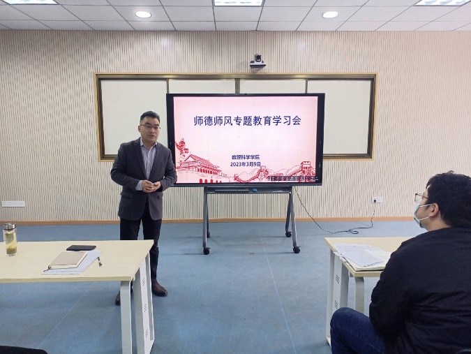 汪胜祥结合违反高校教师职业行为十项准则典型案例,开展师德师风警示教育,重申高校教师纪律,要求全体教师坚决“守住底线,不越红线”。他要求大家通过学习,以案为戒、自查自省,坚守师德师风底线,牢固树立底线意识,增强遵守教师职业行为十项准则的思想自觉和行动自觉,以德施教、以德育教,落实立德树人根本任务,争做“四有”好教师。