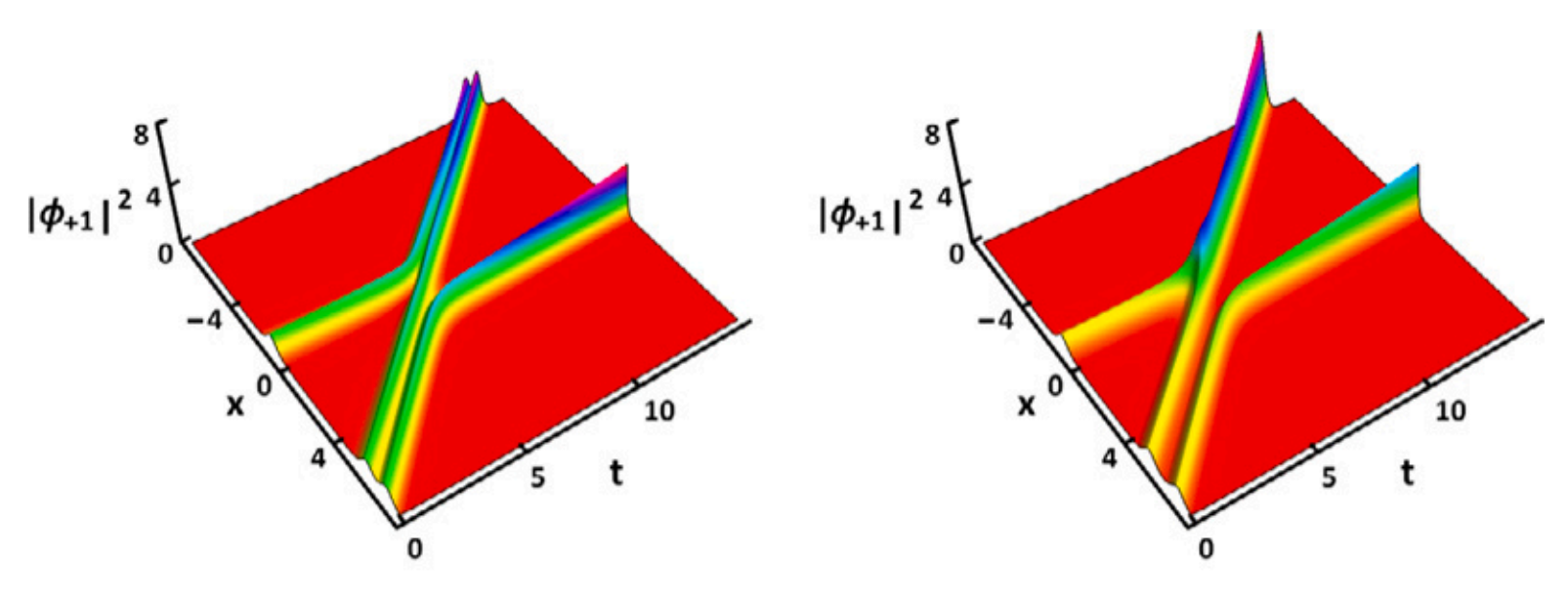 图1:铁磁-反铁磁孤子的相互作用。左图为弹性碰撞,右图为非弹性碰撞引起的自旋交换。