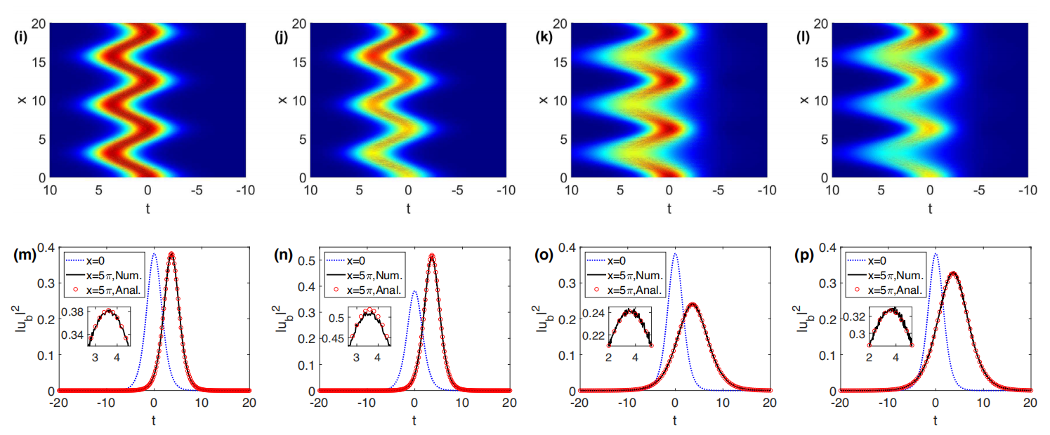 随着光阱技术的发展,玻色-爱因斯坦凝聚(BEC)中原子的自旋自由度得到了释放,形成了旋量BEC,这使得BEC有了更丰富的基态结构和拓扑激发性质,为量子信息的存储和处理提供了更多的选择。光学团队基于达布变换法研究了时空调制复外势作用下三组分(旋量为1)BEC中可控的非自治局域波。通过构建非等谱Lax对,获得了该系统的可积条件,构建了精确的高阶矢量孤子、呼吸子和怪波,发现了具有自压缩、蛇形、阶梯形及呼吸形等不同演化行为的非自治物质波孤子,观察到了铁磁-反铁磁孤子在相互作用中出现的自旋交换现象,得到了具有周期性和抛物线轨迹的拱形和恒定背景上的呼吸子和怪波。该成果相继发表于Chaos, Solitons and Fractals和Chinese Physics Letters,论文第一作者为光学团队青年博士丁崔崔,周勤教授为第一通讯作者,合作者还包括来自孤子领域的国际知名专家,罗马尼亚的Dumitru Mihalache教授和以色列的Boris A. Malomed教授。