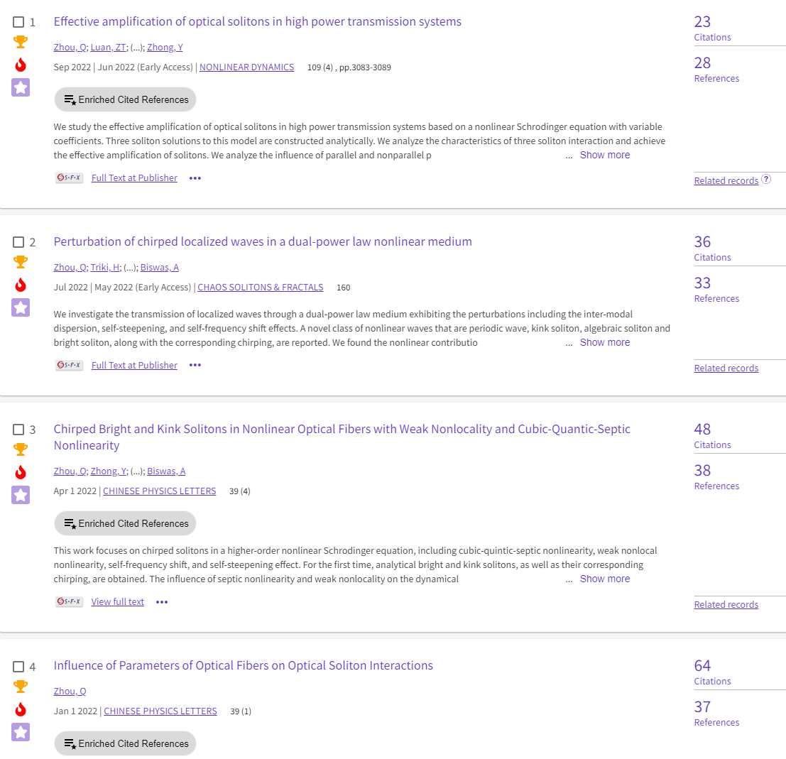 近期,公司周勤教授的“非线性光科学与技术”研究团队(以下简称光学团队)依托纺织新材料与先进加工技术国家重点实验室和英国上市公司官网365非线性中心在非线性波领域的研究取得系列新进展,成果相继发表在Chaos, Solitons and Fractals、Nonlinear Dynamics、Chinese Physics Letters(中国物理快报)、Communications in Theoretical Physics(理论物理通讯)、物理学报等国内外专业期刊。
