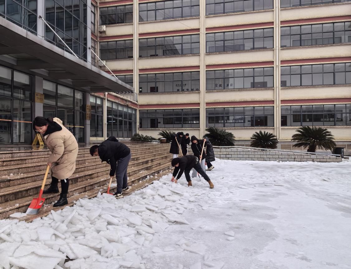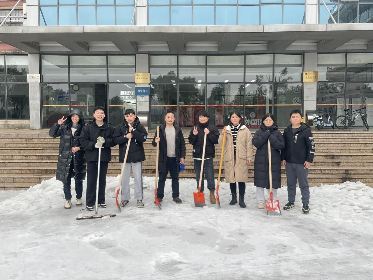 U型的四号教学楼门口小广场雪厚冰实,坎高坡滑,出行存在安全隐患。郭成、万智康、殷浥豪、余荣春、柯璐、王瑞瑞、张秋玉等7名返校研究生自筹铁锹、镰刀等工具,部分同学甚至徒手除冰清路。楼栋值班人员胡仕桥师傅也主动参与奋战。大家齐心协力,忙碌的身影构成了一道亮丽风景。