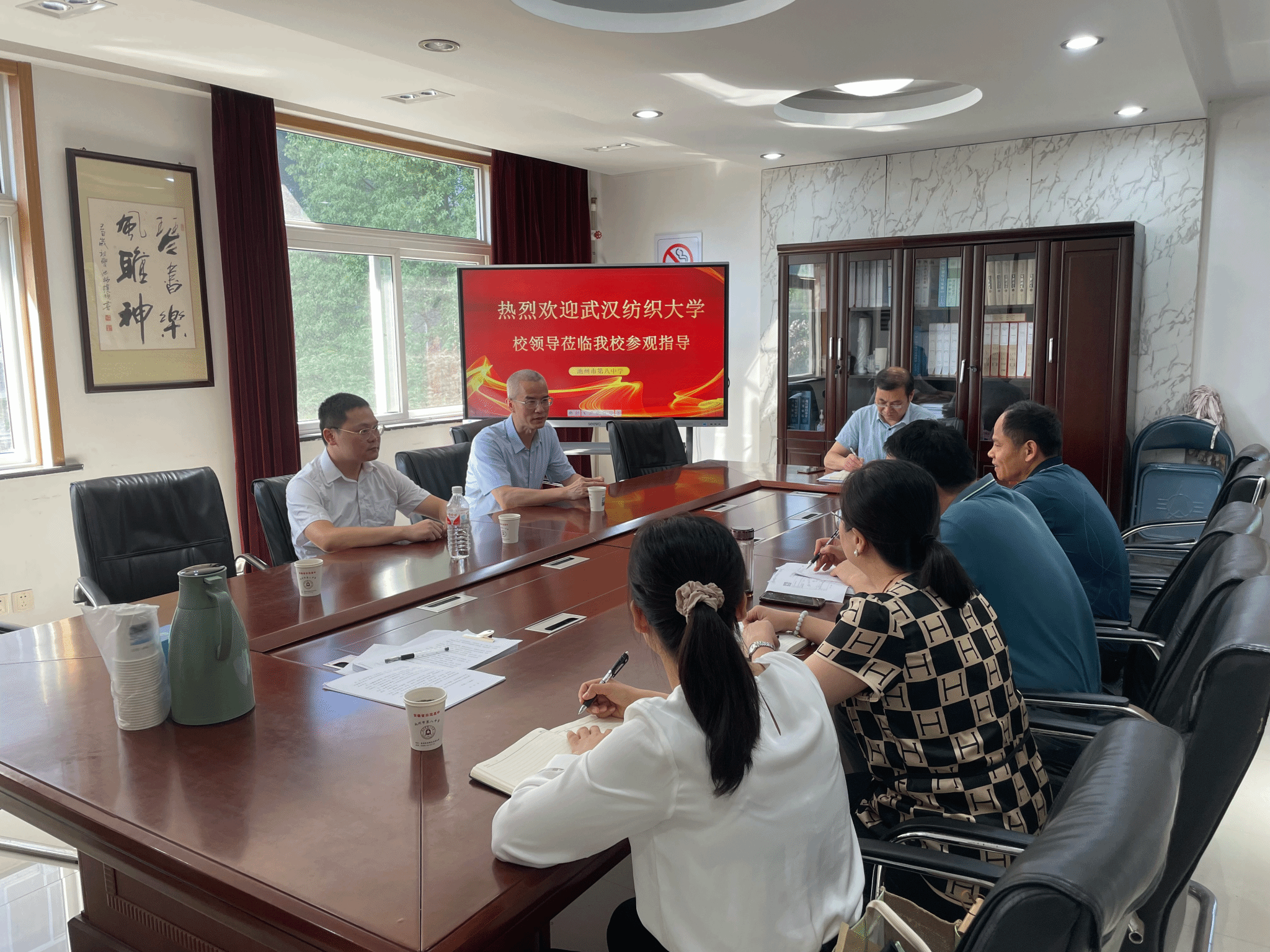 段溢波从有颜值、有内涵、有情怀、有温度、有梦想等5个方面介绍了公司的发展特色,介绍了公司近几年在安徽省的招生情况,池州市第八中学领导对公司取得的成绩表示赞赏。双方就比较关心的招生计划、录取政策、员工发展等问题进行了详尽交流。