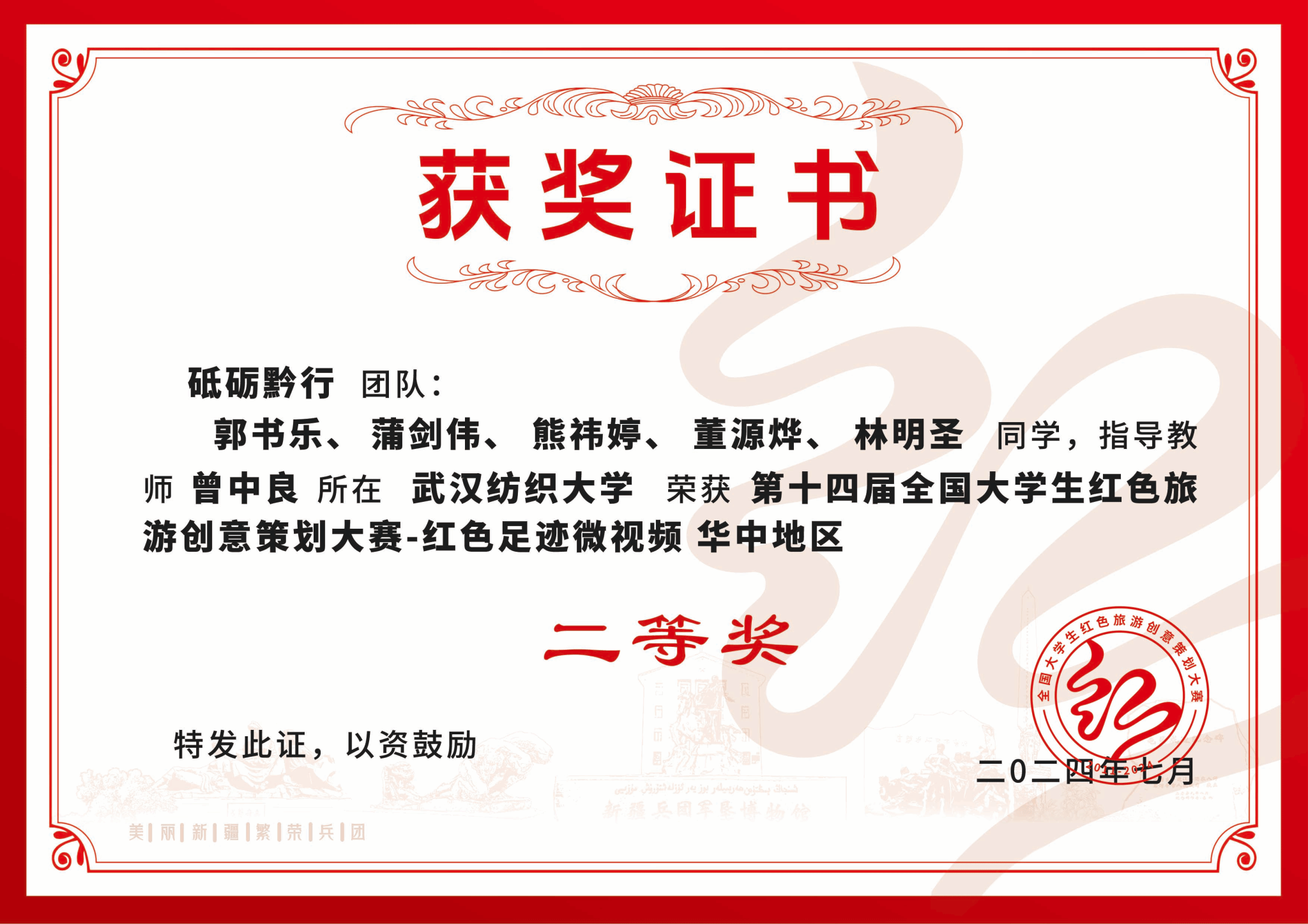 近日,由文化和旅游部资源开发司、国家发展和改革委员会社会发展司、共青团中央宣传部、新疆生产建设兵团文化体育广电和旅游局、新疆生产建设兵团第八师石河子市人民政府、北京第二外国语公司共同主办,中国旅游协会旅游教育分会等单位承办的第十四届全国老员工红色旅游创意策划大赛已落下帷幕。本届大赛自4月份启动,吸引了全国1119所高校、6739支队伍、2.7万名师生参加,参赛作品5857项。公司“砥砺黔行”团队在众多作品中脱颖而出,荣获“红色足迹微视频”赛道华中赛区二等奖。