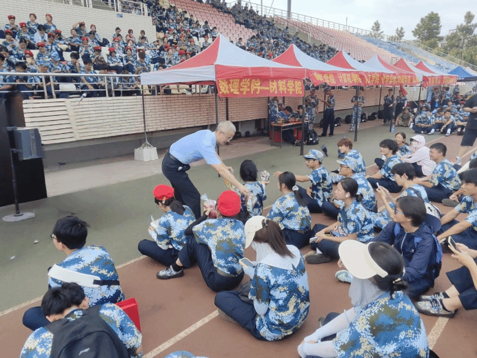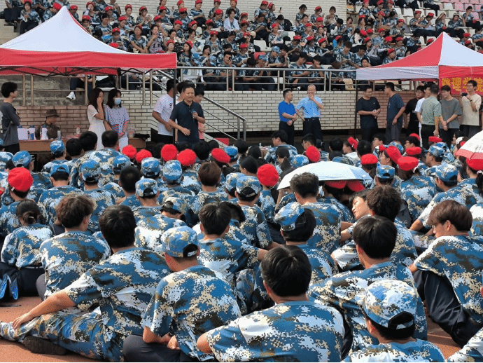 段书记与同学们亲切交谈,询问大家的身体状况和军训感受,表达了对大一新生的中秋祝福,对同学们在烈日下坚持训练、不畏艰苦的精神表达了赞扬。汪经理肯定了同学们在军训中的优异表现,表达了对大一新生的期待和鼓励,叮嘱同学们注意防暑降温,保持健康的生活习惯。
