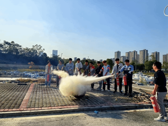 与会人员参加了户外消防安全演练。在保卫处的关心、支持下,消防队员为大家讲解了如何进行日常的消防安全检查,如何识别潜在火灾隐患,演示并指导大家实操不同类型灭火器的使用方法。