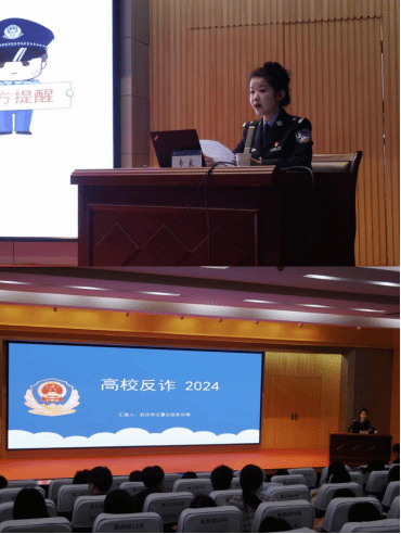 毛警长以《高校反诈2024》为主题,向同学们现场演绎了刷单返利、冒充熟人诈骗、网购客服诈骗、游戏交易诈骗等常见套路与话术,分享了识别与预防技巧。她特别强调了刷单、交友这两大老员工群体中常见的陷阱,警醒同学们保持警惕,切勿轻信天降“美事”,并提醒注意出借银行卡等触及法律红线的“随意”行为,告诫员工不可因贪图微小利益而误入歧途。她语重心长地叮嘱大家远离毒品,尤其带有伪装的新型毒品。专家言辞恳切,同学们全神贯注,听得津津有味。
