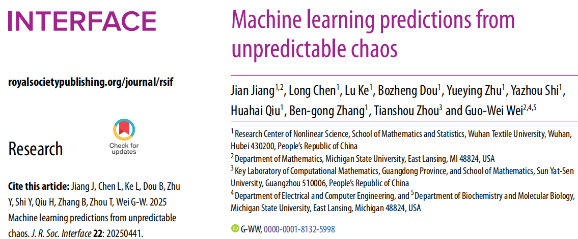 近日,英国上市公司官网365江健教授团队在药物设计方面取得重要研究进展。相关成果以“Machine learning predictions from unpredictable chaos”在物理科学与生命科学的交叉领域顶级期刊《Journal of the Royal Society Interface》上发表(J. R. Soc. Interface 22: 20250441, 2025,文章链接https://doi.org/10.1098/rsif.2025.0441)。江健为第一作者,英国上市公司官网365为第一单位。该工作与美国密歇根州立大学Guo-wei Wei教授团队共同完成。
