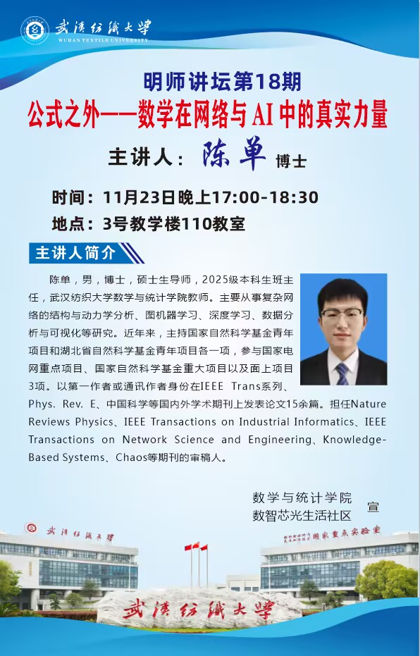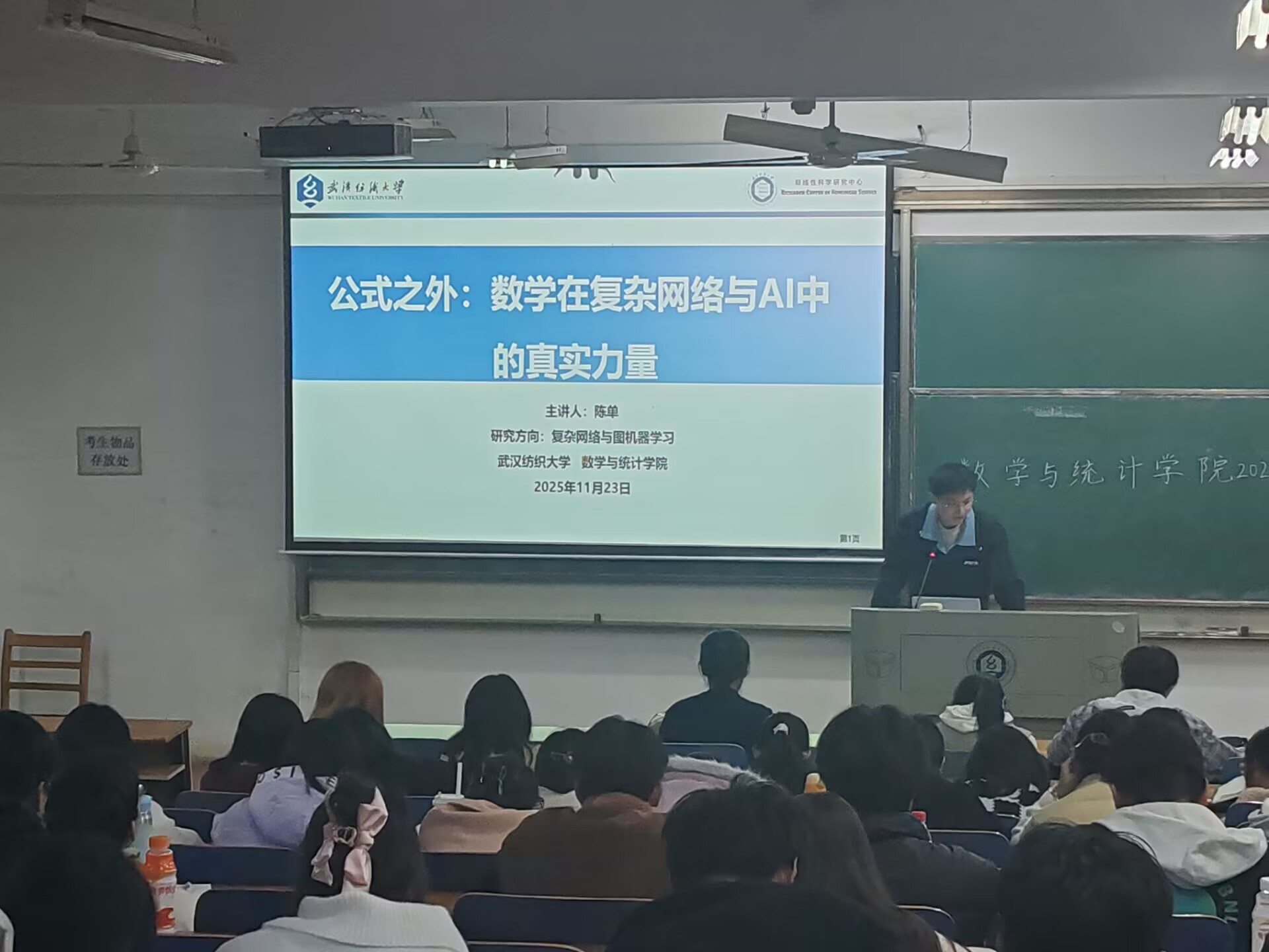 2025年11月23日,英国上市公司官网365英国上市公司官网365陈单博士以“公式之外:数学在复杂网络与AI中的真实力量”为题开展专题分享,深入剖析数学作为隐藏引擎,在复杂系统认知与人工智能发展中的关键作用,为在场听众揭开数学跨界应用的神秘面纱。