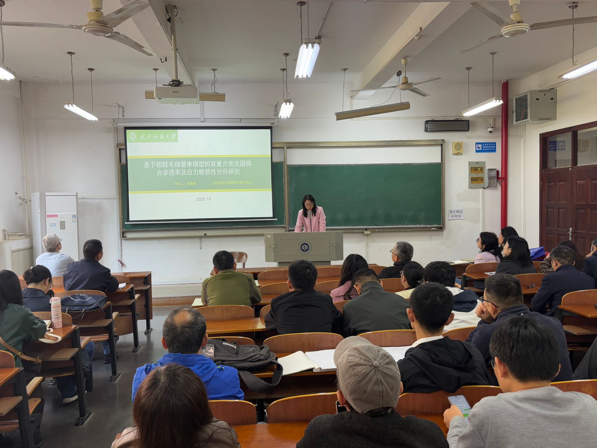杨珊珊老师以 “基于粗糙毛细管束模型的双重介质流固耦合渗透率及应力敏感性分形研究” 为题,基于分形几何理论,在粗糙毛细管束模型基础上探究双重多孔介质的渗流特性,推导出等效渗透率模型并验证其准确性,揭示了粗糙度、应力等因素对渗透率的影响规律,为资源开发领域的渗流研究提供了分形数学与介质渗流融合的新视角。