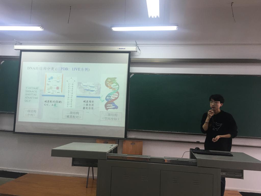 本次汇报的3名本科生均来自信科11701班。王后浪同学报告的题目是《一维数据建模的MATLAB实现与应用》,介绍了Lagrange插值、Newton插值、三次样条插值与最小二乘拟合是如何在MATLAB实现的,并且对比了在MATLAB上Lagrange插值和Newton插值的区别,而且将三次样条插值和最小二乘拟合与MATLAB相结合去解决遇到的实际问题。徐珂同学报告的题目是《傅立叶级数及FFT算法》,讨论了傅里叶级数与傅里叶变换,其中有周期信号的傅里叶级数的两种表现形式,傅里叶变换中的DFS与DFT及FFT算法,傅里叶级数和傅里叶变换一般都是将时域的信号变化到频域上,然后在频域上再进行相应的分析。赵博同学报告的题目是《粗粒化模型预测DNA单链分子的空间结构》,介绍DNA相关信息、DNA粗粒化模型EFOLD,并通过蒙特卡洛模拟退火方法和metropolis法则寻找DNA空间结构,模拟出单链DNA分子的空间结构。