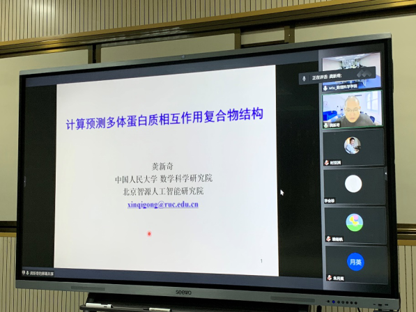 为学习宣传贯彻党的二十大精神,大力促进学科交叉、加强团队合作、提高学术能力、增强学术自信,在公司大力支持下,第231期阳光论坛暨第57期学术沙龙活动于11月11日在206教研室成功举办。本次活动邀请中国人民大学数学科学研究院龚新奇教授做题为“计算预测多体蛋白质相互作用复合物结构”的线上报告。本次活动由数学与应用数学系主任江健教授主持,副经理郑仟副教授,数学专业的相关老师以及全体研究生同学参加了本次研讨活动。