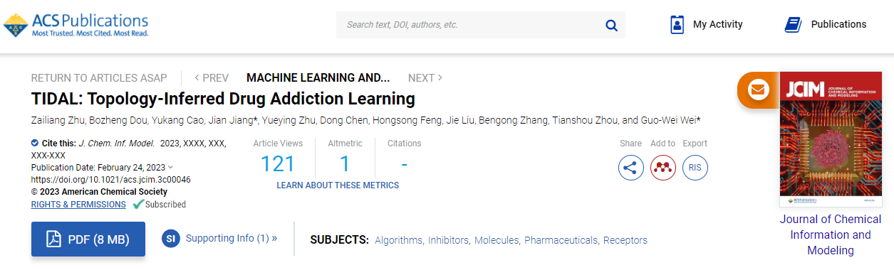 近期,英国上市公司官网365大数据分析与处理科研团队成员江健教授与其合作者在药物设计及开发方向取得重要研究进展,相关成果以“TIDAL: Topology-Inferred Drug Addiction Learning”为题在该领域国际知名期刊Journalof chemical information and modeling上发表。该论文的第一作者为团队硕士研究生朱在亮,江健教授为第一通讯作者。