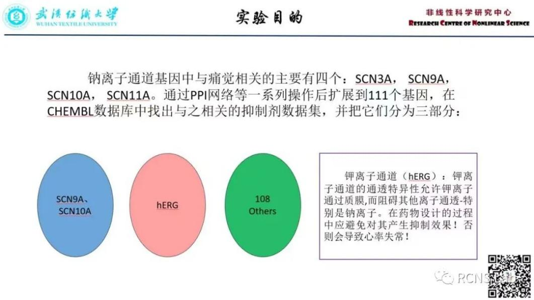 窦博正:本次汇报的内容是自己的研究进展,钠离子通道中与疼痛相关基因有SCN3A,SCN9A,SCN10A和SCN11A,在之前的研究中已经查找了这些基因相关的其他基因,并收集了与之相关的抑制剂数据集,再通过机器学习方法预测了基因和数据集之间交叉靶点BA值。而后根据这些BA值对数据集中的分子进行筛选,筛选的条件包括:对9A和10A基因有效,对hERG无副作用等条件,找出了三个符合要求的先导化合物,这些先导化合物具有相当大的实际意义。