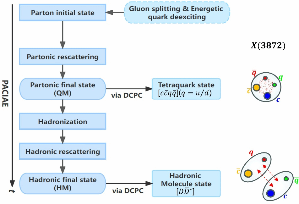 作为第一个在实验上被发现的奇特态粒子X(3872),其性质一直是粒子物理理论与实验研究的热点。然而,目前对其内部结构的解释尚存争议。其中,弱束缚的强子分子态和紧致的四夸克态是最为流行的两种观点。佘博士及合作者利用Monte Carlo微观输运模型——部分子强子级联模型(PACIAE)[2]实现了在部分子末态中和强子末态中分别产生四夸克态和强子分子态的X(3872)粒子的新方案,并提出和验证了多种可能的区分两种内部结构的新实验判据,如形成时间、平均速度、快度分布、横动量分布等。