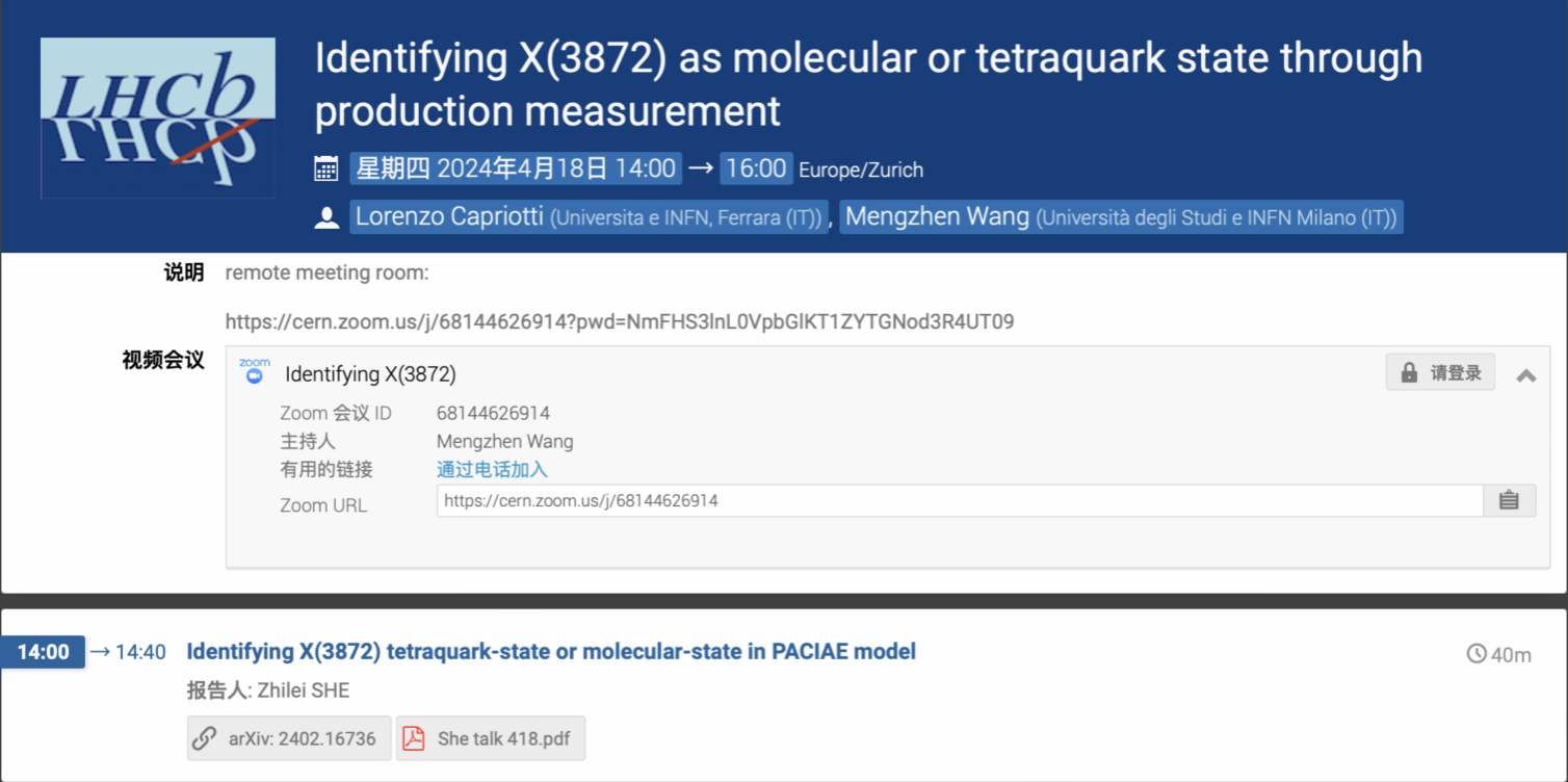 此外,此研究工作上传至预印本(arXiv:2402.16736),便引起了欧洲核子研究中心(CERN)LHCb实验国际合作组的“底强子和夸克偶素”实验组、挪威奥斯陆大学高能物理组等国内外同行的广泛关注,并被多次邀请做主题报告。佘博士及合作者与专家学者们进行了深入的讨论和交流,为未来更好地国内外合作与交流奠定了基础。