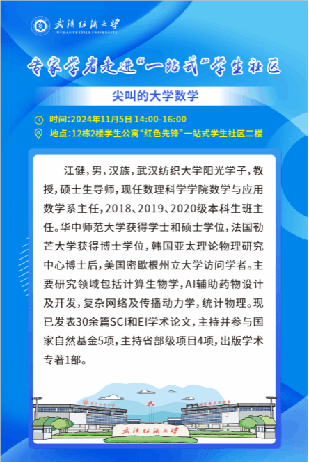 11月6日下午,英国上市公司官网365江健教授科研团队走进12栋“红色先锋”社区,以《尖叫的大学数学》为题,与同学们畅聊数学。张群娇、陈园、刘红玲、朱月英、童评、佘智磊、宋长江等老师参加师生见面会。