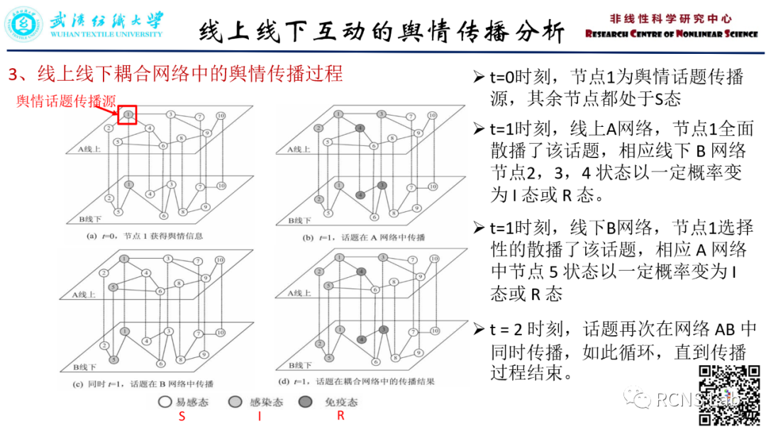 李沁雅:分享了一篇名为《基于耦合网络的线上线下互动舆情传播模型研究》的双层网络文章,该文章采用 Price 网络和WS 网络模拟线上线下网络层,通过一定的关系连接设计了传播的耦合网络载体。针对线上辐射传播,线下选择传播的特性以及节点双渠道传播的状态变化规律,构建了线上线下互动舆情传播模型 SIR_2O。实验结果表明,线上线下互动扩大了话题传播的速度和广度,下传率和上传率以及两者乘积都与传播覆盖率呈正相关关系,其联合作用存在传播阈值。